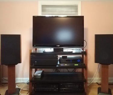 I built this rack for my office to hold my stereo and TV in my office. The posts were made by laminating two 8x36 pieces of 4/4 Mahogany I found at the WoodCraft store. The shelves are made from 1/2 MDF with ribs cut from 3/4 MDF. As you can see by the sagging shelves in the photograph this was a design mistake. To make the shelves stiffer I have updated the design to use more ribs made from 3/4 plywood. The shelves are laminated with black matte Formica. The second design mistake was attaching the posts to the shelves with hanger bolts, this made for a nice aesthetic look, but caused the rack to wobble. This is solved in the updated design by adding cross pieces between the side posts.