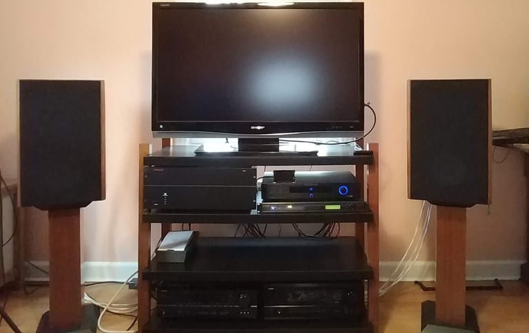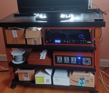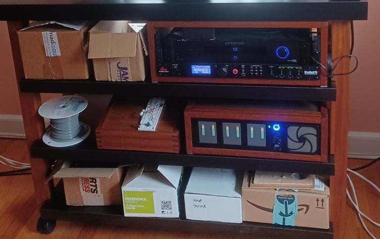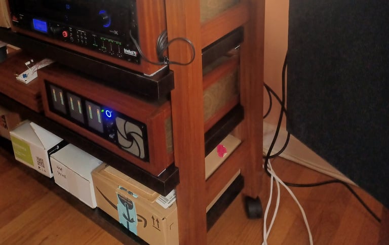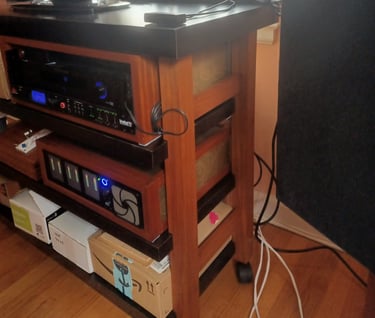 This is the redesigned A/V Stand because the original shelves sagged and wobbled. The reason are detailed below. In addition to the change in the hanger bolts have been replaced with threaded inserts. This design can be knocked down completely. It also has lockable wheels and a power strip attached. The legs 2 by 2 inch made from 3 layers quarter sawn 3/4 inch sapele. The top and shelves are constructed using 15 mm Baltic Birch (They were supposed to be 12mm but there was a mistake at the lumber yard) tops with 18 mm ribs. The shelves are laminated in matte black Formica and the undersides are painted flat black. The legs are connected to prevent racking and are finished with 3 coats of amber shellac.