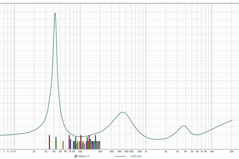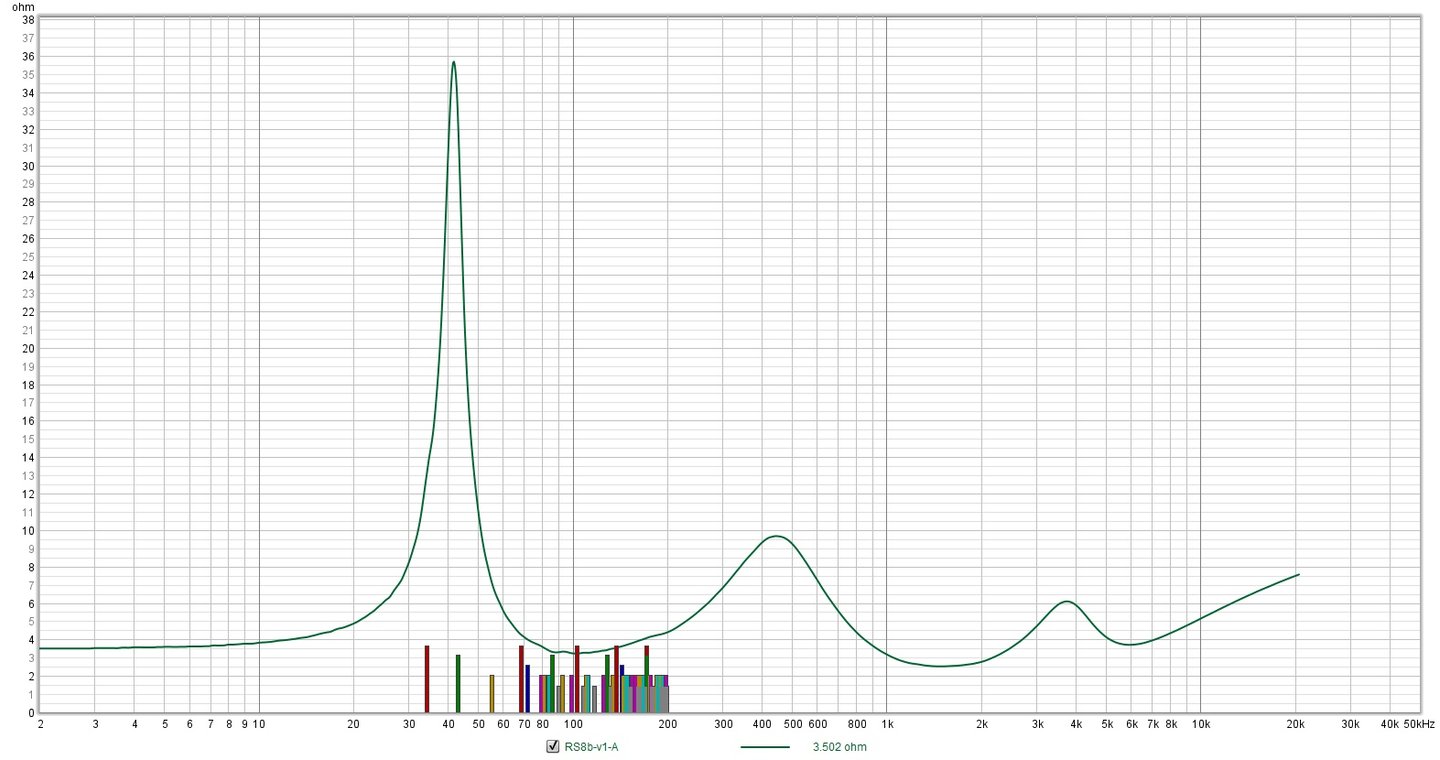 The BRF-38B is a sealed three way stand mount speaker. It uses an 8 inch SBAcoustics SB23CACS45-4 ceramic cone woofer, a 4 inch SBAcoustics SB12MNRX25-4 midrange and a Fountek NeoCD1.0 ribbon tweeter. The drivers are crossed at approximately 500Hz and 4000Hz. The woofer enclosure volume is roughly 32 liters tuned to 52Hz with a Qtc of 0.732 . The dedicated midrange enclosure is 2.25 liters with a Qtc of 0.549 this yielded an f3 around 600Hz which works well with the 500Hz low pass crossover.