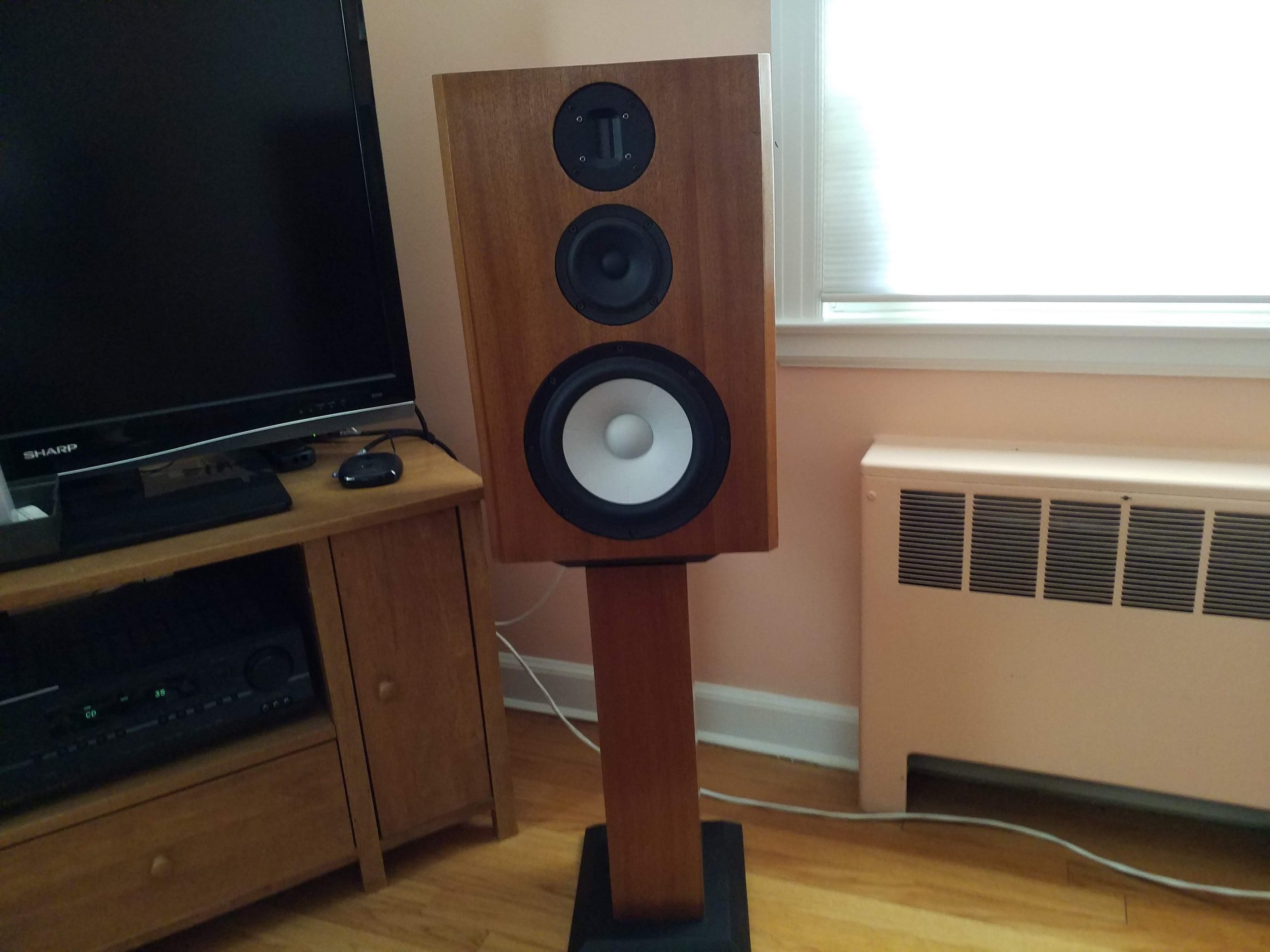 So after a year of designing I end up with something very conventional, a rectangular box with the external dimensions of 21” x 13.5” x 12.75”. I decided to go sealed because I intend to use them in my office to listen to 2 channel music and the original RS8B’s were sealed. I went back and forth with driver placement but finally vertically aligned them instead of offsetting the midrange or tweeter. This might have been a mistake but what I have read either alignment will have its advantages. The internal volume nets about 32 liters and a Qts of .732 after accounting for the drivers, 2.5 liter midrange chamber and woofer displacement. I braced the cabinet with two horizontal braces that connect the sides and front and backs. These braces also create the top and bottom of the midrange enclosure. I ripped some scrap MDF at 45 degrees and glued to the back of the midrange chamber to breakup any reflections, I don’t know if it matters, but it didn’t cost anything. Everything is made of ¾ inch Baltic birch, except the baffle and the back panel. The baffle is ¾ inch MDF and ½ MDF laminated together and the back is just ¾ MDF. This is not the big box MDF, it is not brown, but the whiter stuff, not even close in quality and unfortunately not close in price. Finally I veneered it in striped mahogany finished with 3 coats of amber shellac. It has grills made of 1/8 inch hardboard attached by magnets buried under the veneer. I had leftover BB and veneer so I copied a picture of some stands I saw on the internet, obviously a clear patent infringement.
