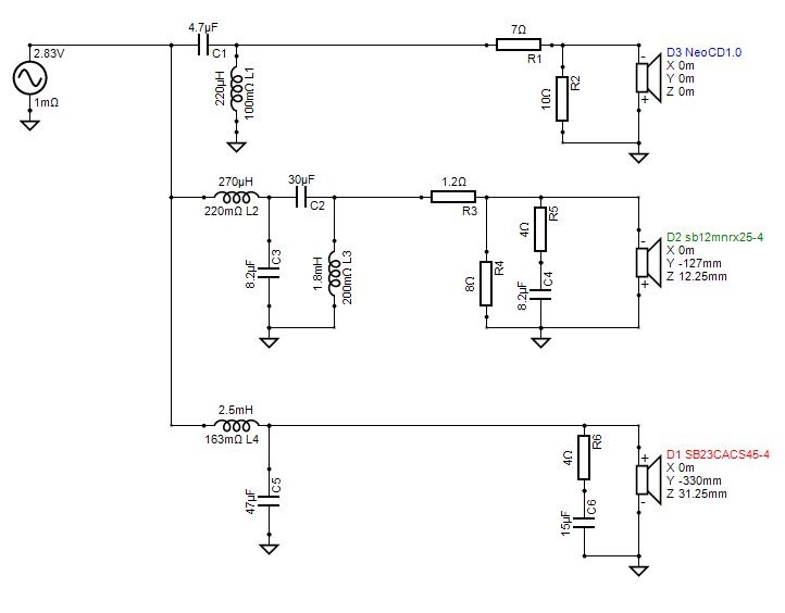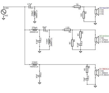 I picked 500Hz and 4KHz for crossover points. This is my second three way and I found the textbooks are correct and the bandpass needs to be at least 3 octaves or more. Anything smaller and the low pass and high pass elements will create some really strange responses. I used my 3 channel amplifier built around the Dayton Audio DSPB-100 to verify these crossover points. I then used XSim and ran through at least 12 iterations before settling on my final design. I was able to simplify it quite a bit, but still ended up with Zobels and two L-Pads. I was able to remove the baffle step compensation circuits on both the midrange and woofer. I assume this is mostly because of the crossover point which is very near the baffle step frequency. After removing the BSC from the simulation I adjusted the component values to smooth what little baffle step that remained. I use L-Pads instead of series resisters because L-Pads seem not change the transfer function of the filters as much. Lastly I adjusted the L-Pad values by measuring and listening to music after using XSim to give starting points.