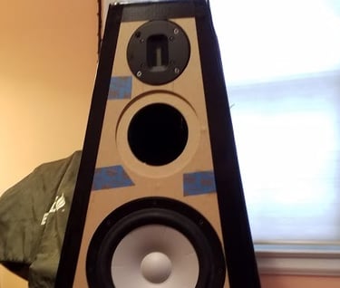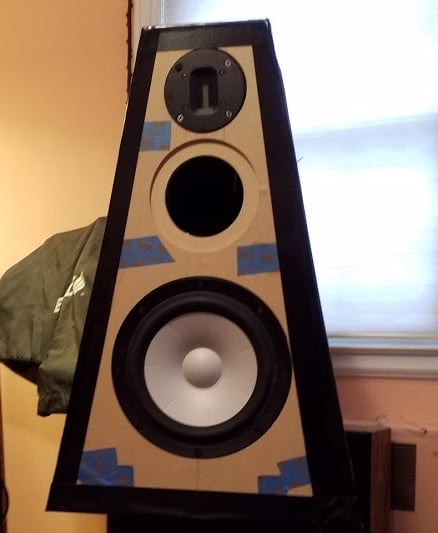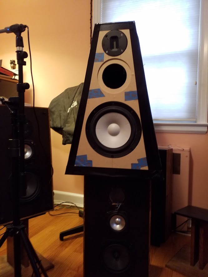Before I started ordering parts, Madison Sound put the SB Acoustics SB23CACS45-4 8" ceramic woofer on sale for $89.00 each. Having just used the 5 inch version in my towers as a midrange and liking the sound I figured why not go bigger than the 6.5 inch Audax woofers so I bought them. I already had a pair of Fountek NeoCd1.0 1.5 Ribbon Tweeters so all I needed was a pair of midrange drivers. Finally I choose to use the just released SB12MNRX2-25-4 midrange. While waiting for these to cross the ocean in a slow boat I built my test enclosure. I decided to try a trapezoidal enclosure even if it was going to be more difficult to build. I had been reading about all the benefits of non-parallel sides on internal reflections. After waiting 3 months for the midranges I finally ran some measurements of the very stylish test enclosure. Much to my surprise and that of others on the DIY forums a trapezoidal enclosure makes an ugly mess of edge diffractions. I was disappointed but I decided that an old school rectangular baffle would sound better than my midcentury modern cabinet.