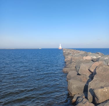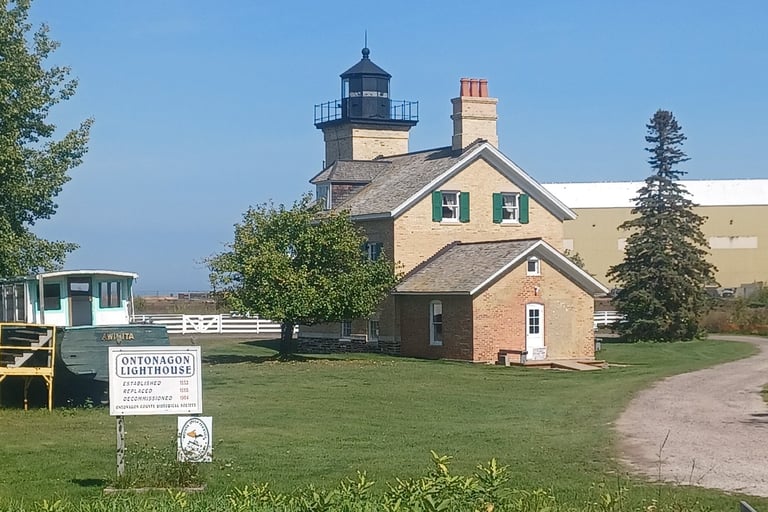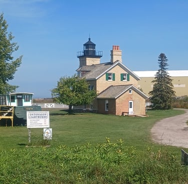 I proceeded to drive very fast on the two-lane roads of the Upper Peninsula. I was no problem because there is nothing there, no houses, no cops, and very few cars. There was a slight delay getting to the Ontonagon Lighthouse because the GPS directed me to the wrong side of a river to a mineral shop. I looked around the shop for a while, thinking I might buy a Lake Superior agate, but they are mostly brown and not that interesting. I drove to the other side of the river and ate my lunch in the lighthouse parking lot.