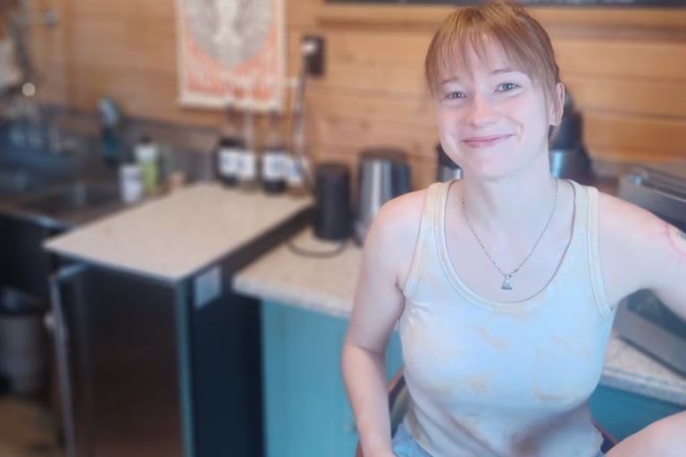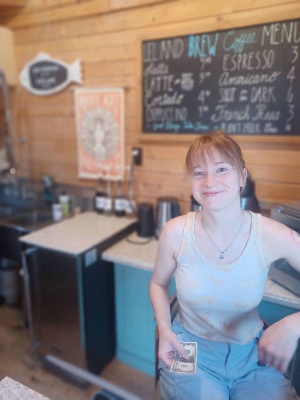 Fishtown in Leland, MI, where I got a double espresso at Leland Brew. It was a quality pour into my cup I bought in St. Augustine. Fishtown consists of about eight shacks that house some stores and a fish market; there was not much to see. I went up the hill and bought a lightweight hoodie to replace the one I just tore a hole in at Sleeping Bear. When I tried it on, I put my espresso cup down and forgot it. I didn’t realize it was gone until I was eating lunch an hour and a half later. One cup down.
