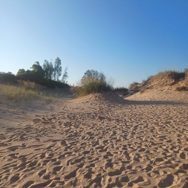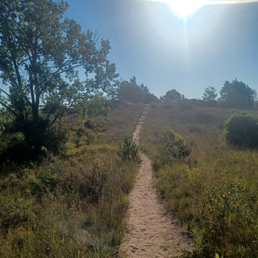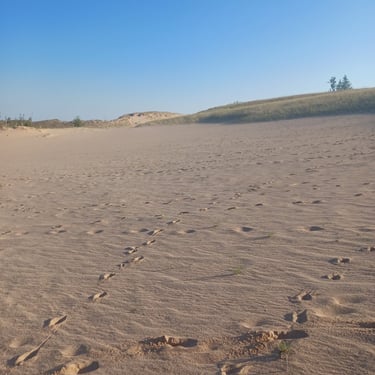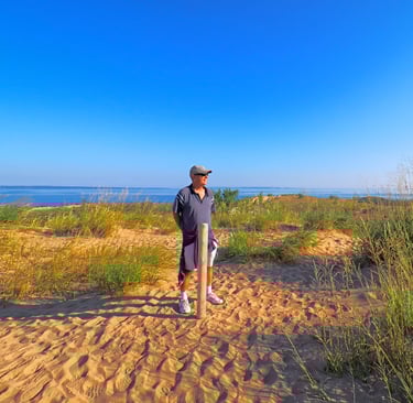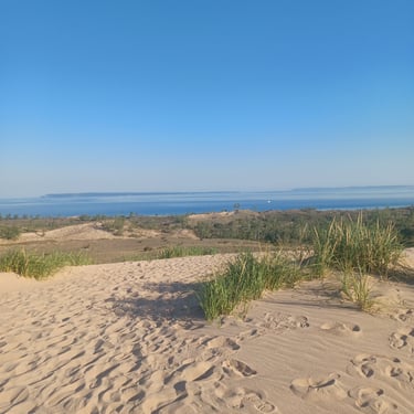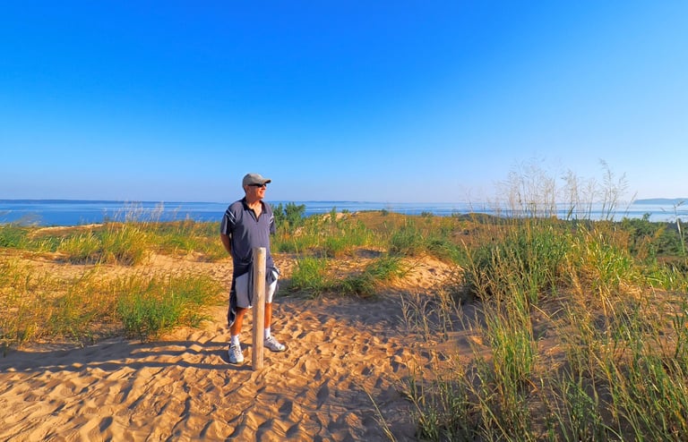 Once again I left the hotel on time and drove straight to the Sleeping Bear Point Trailhead. This was the easier dune trail, and I was glad I chose it. It is roughly a three-mile hike going up and down a few 40 to 50-foot-high sand dunes. I’m in good shape, and this kind of length of a hike is no problem except that the dunes are deep, fine sand, which easily doubles the effort required to walk. Roughly at the halfway point I met a retired couple, and we talked for a bit. His name was Steve, and he had a 35mm camera, and after he heard my story about the trip, he asked, “Do you have any photos of yourself on this trip?” I said, “That’s not necessary.” His wife, Janie, said, “If you have a card, we can email the photos to you.” He staged a handful of shots, and I went on my way. The last quarter mile of the hike was through a wooded area without the sand, so it was an easy hike.