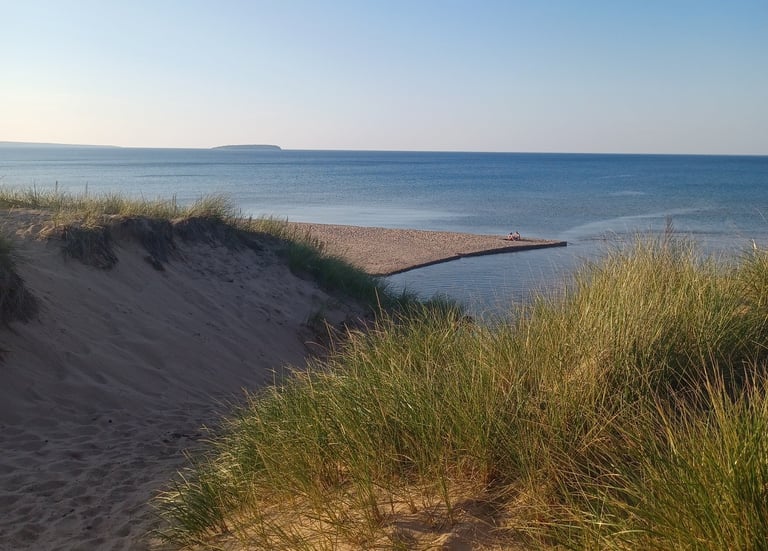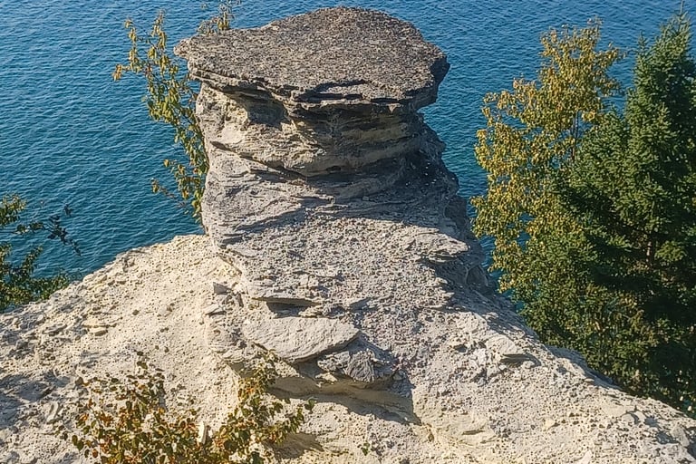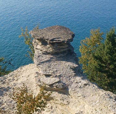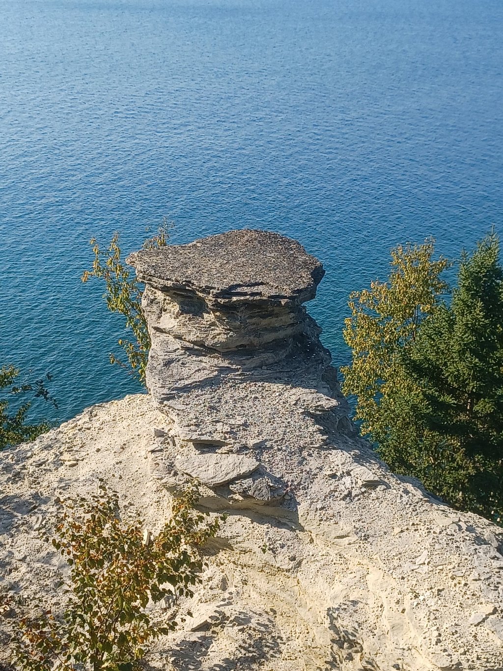 I swam in Lake Superior (if you can call it swimming if it is in three feet of water) at Sand Point Beach on the Pictured Rock Lakeshore. I wanted to see Pictured Rock but I wasn’t willing to take a cruise. I searched the internet and discovered that it can be seen from Miner’s Castle. The first place I stopped was a three-mile hike away from Miner’s Castle. I was speaking with two women, one of whom had been there before and said there was a parking lot right near it. I then drove to Miner’s Beach, and they arrived right behind me. There was a map there that said Miner’s Castle was a half-mile hike. I was moving fast on the trail and left them far behind me. Whatever trail I took, it was over a mile, not a half mile, but I finally got to where I wanted to go. The Pictured Rock is so far away I could barely make out the colors. I returned to Miner’s Beach parking lot without seeing the two women. I had assumed they had given up and turned back. I hoped that they weren’t lost out in the woods somewhere.