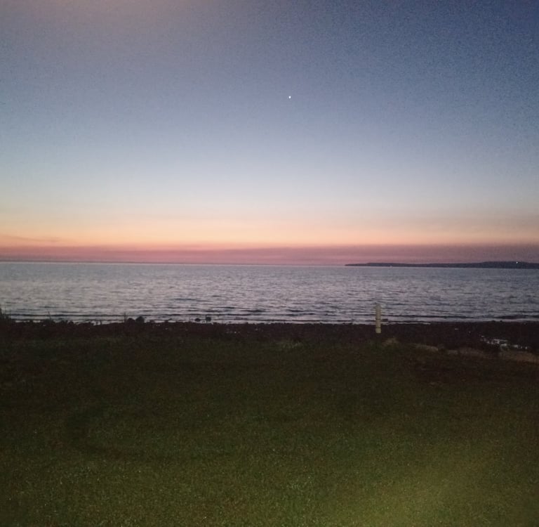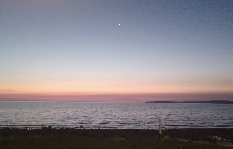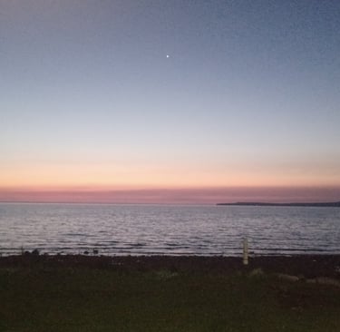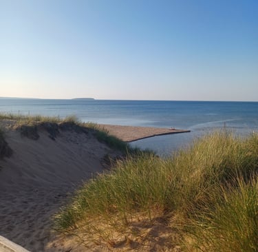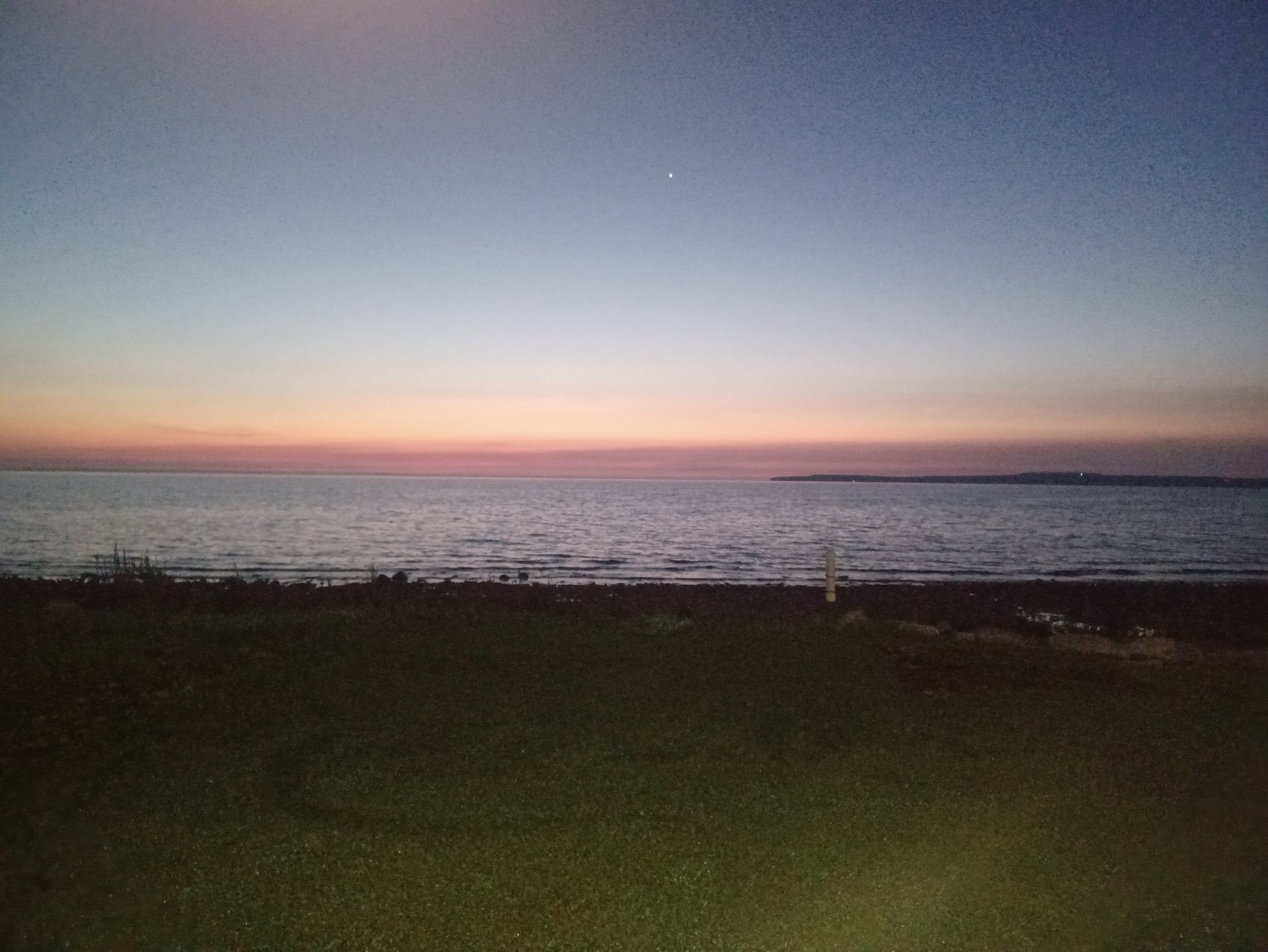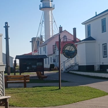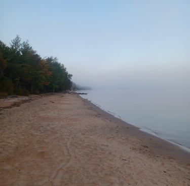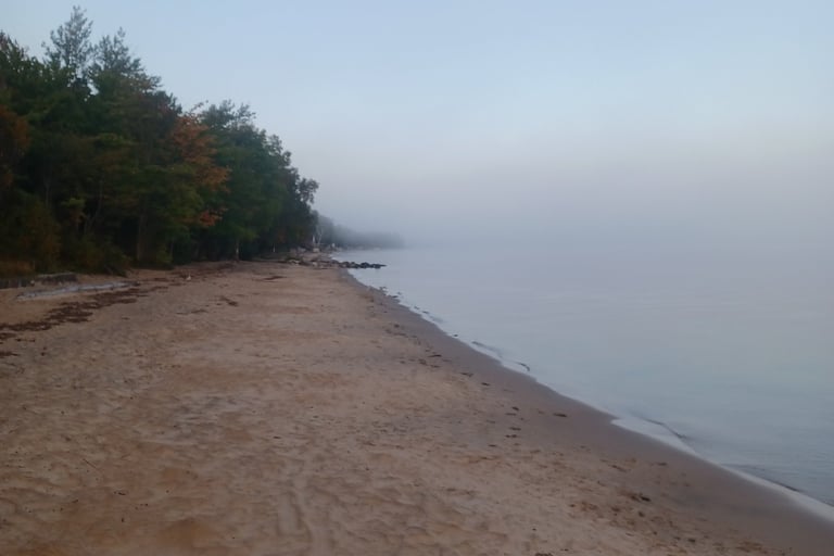 The sun was rising as I left the hotel, so I took a few pictures of the sunrise over Lake Huron. It was a foggy morning, and it still was when I reached Brimley Beach. There is not much to say, but it was my first glimpse of Lake Superior. The next stop was the Point Iroquois Lighthouse, which was closed. I walked down a boardwalk to the beach. There was a fellow there connecting rocks, but I didn’t talk to him.