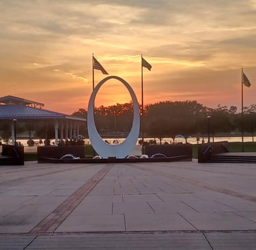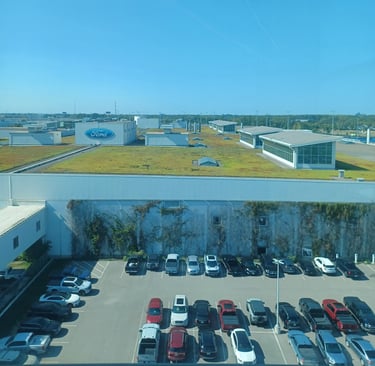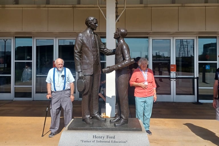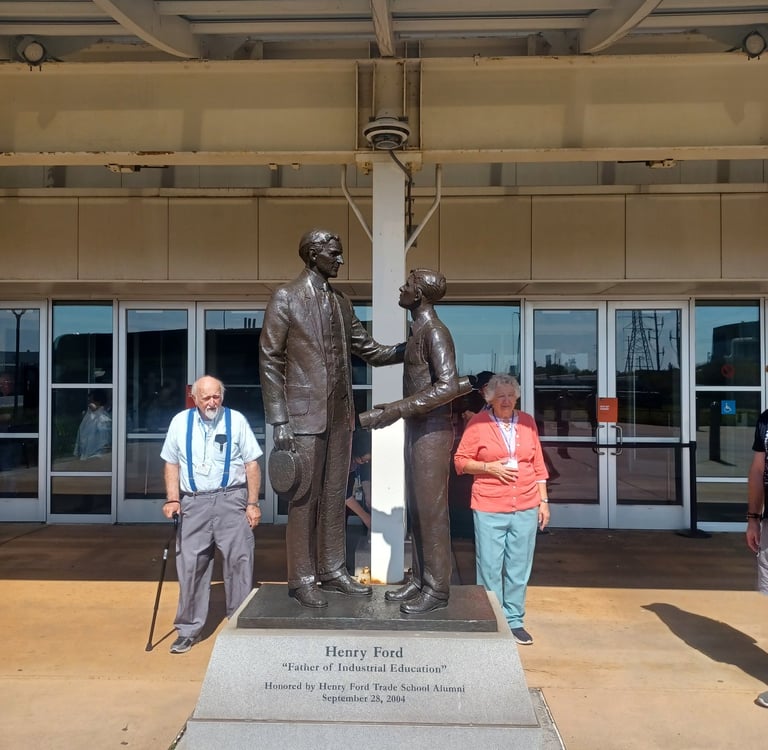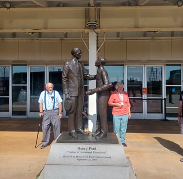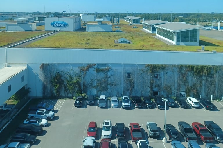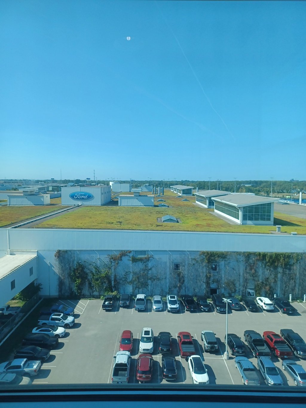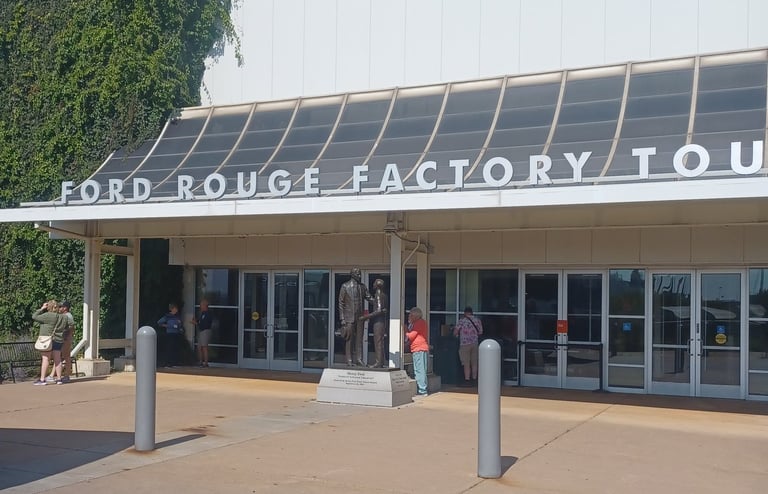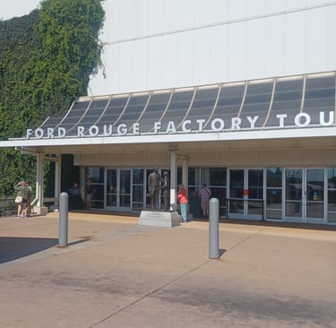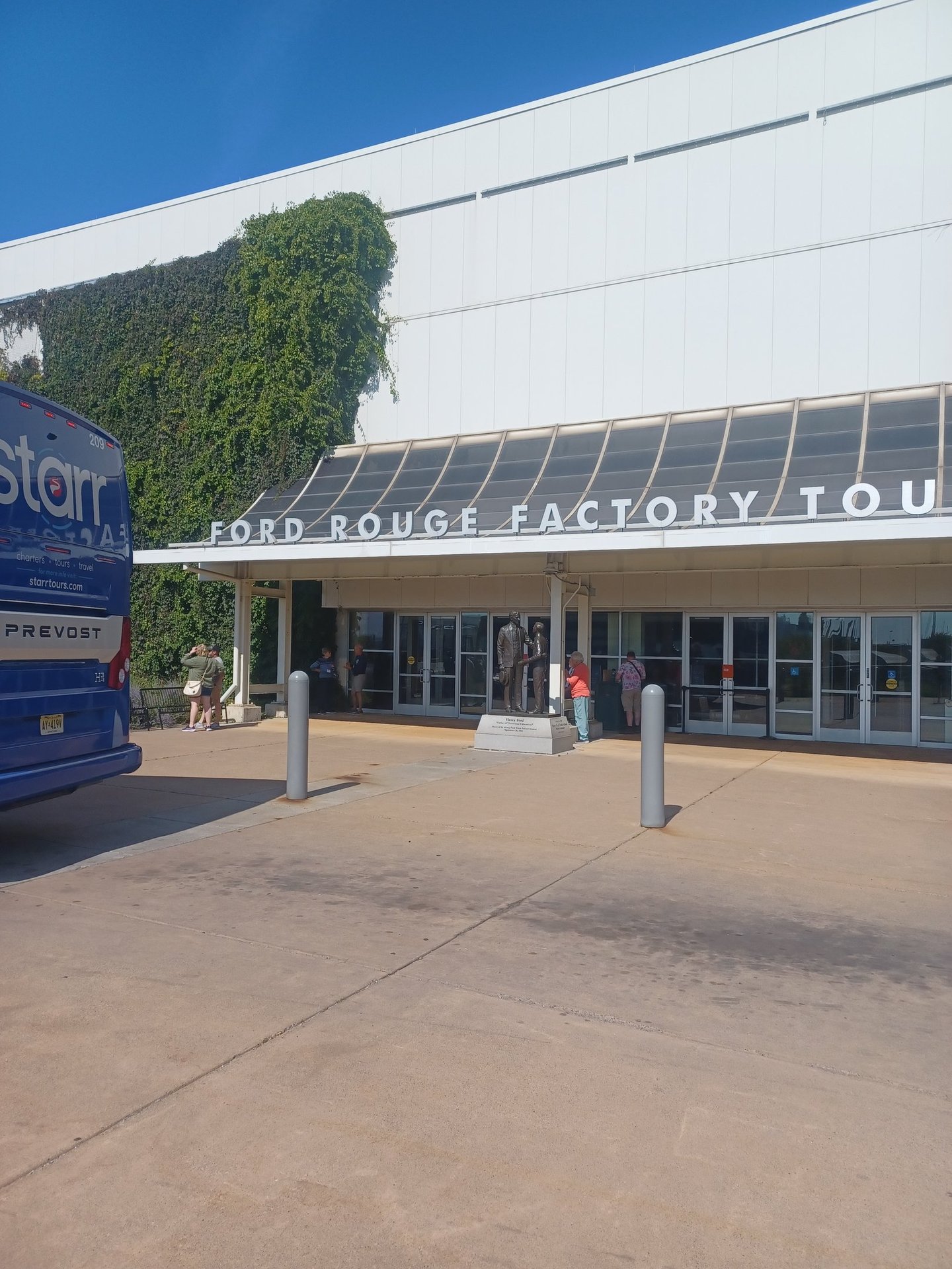 Even though I got out of the hotel on time, I was already forty-five minutes behind. I wanted to get to the Ford Factory tour on time, so I had to skip the stop at the National Museum of the Great Lakes. I arrived at the shuttle bus for the factory tour just as it was loading. The Rouge F-150 factory is a twenty-minute bus ride from the welcome center. There are six exhibits, two of which are movies that I skipped. The most fascinating exhibit is the catwalk around the final assembly line. Much to my surprise, most of the final assembly is done by human workers, not robots. The large parts, like the doors, cabs, and beds, all arrive at the workers' stations on conveyors, where they attach the various parts. The small parts are all delivered to the stations in containers by other workers. I spent about an hour watching and decided I did not want their jobs. I ate lunch in the parking lot after the tour.