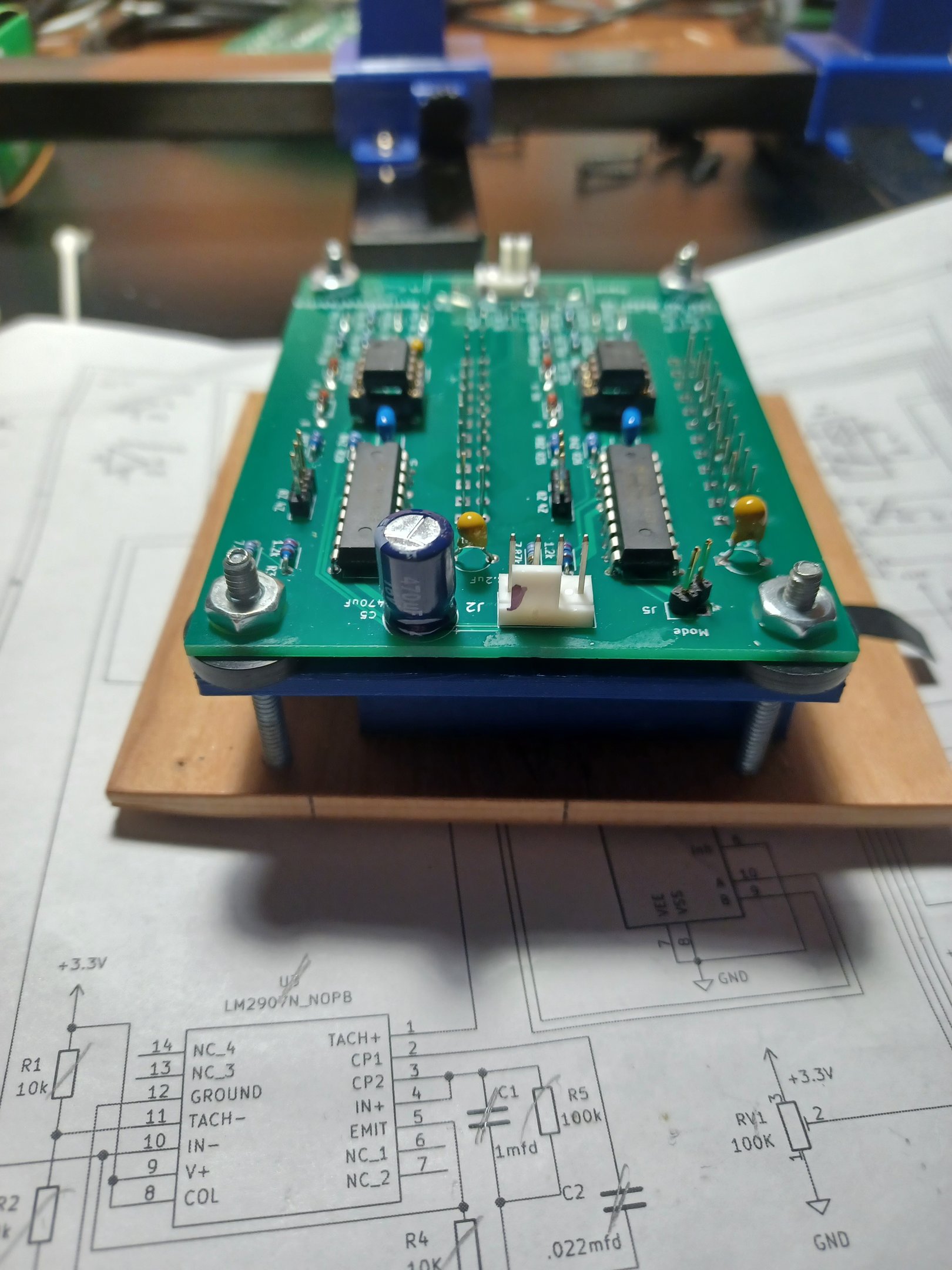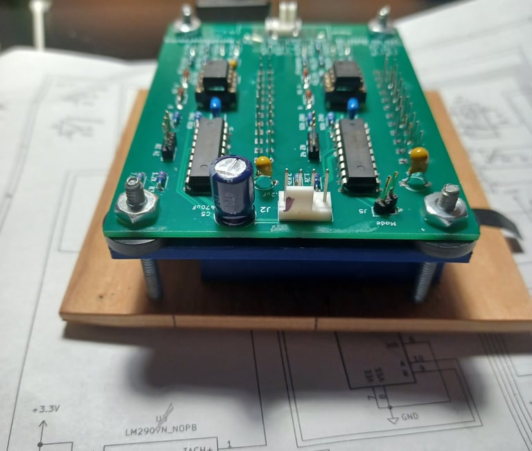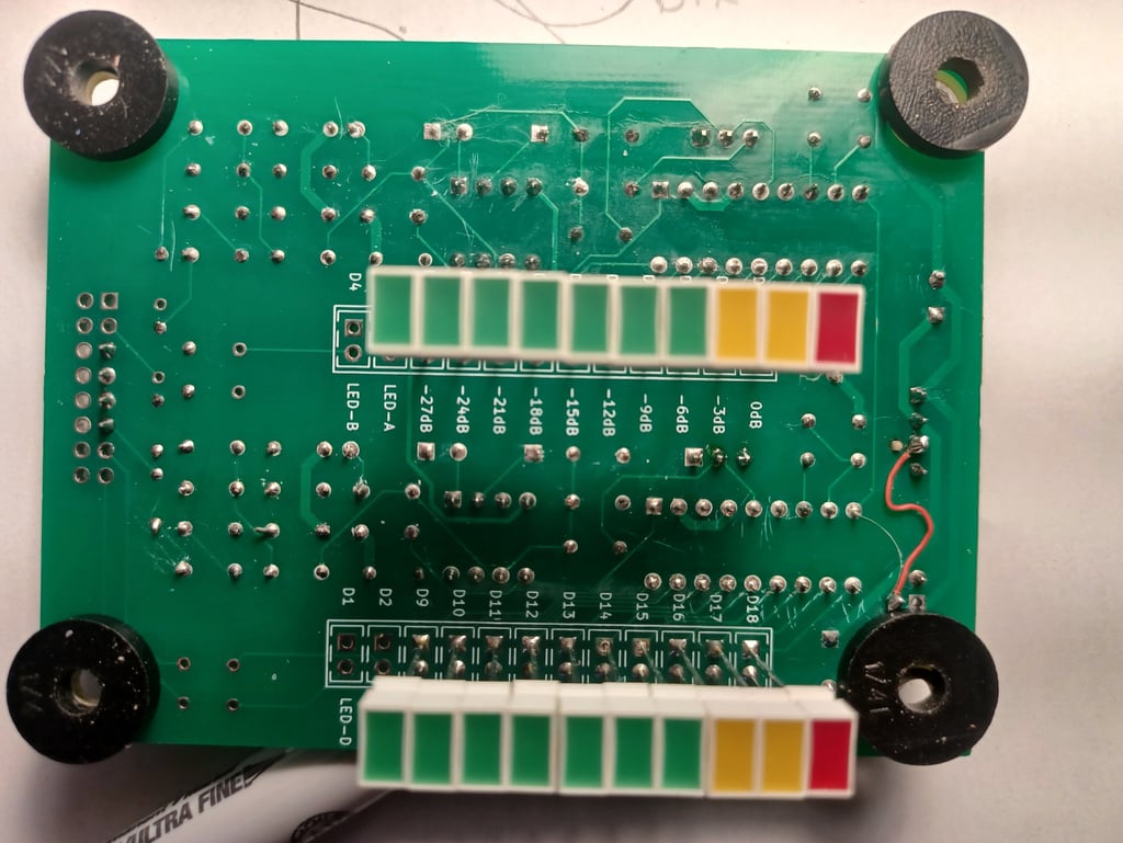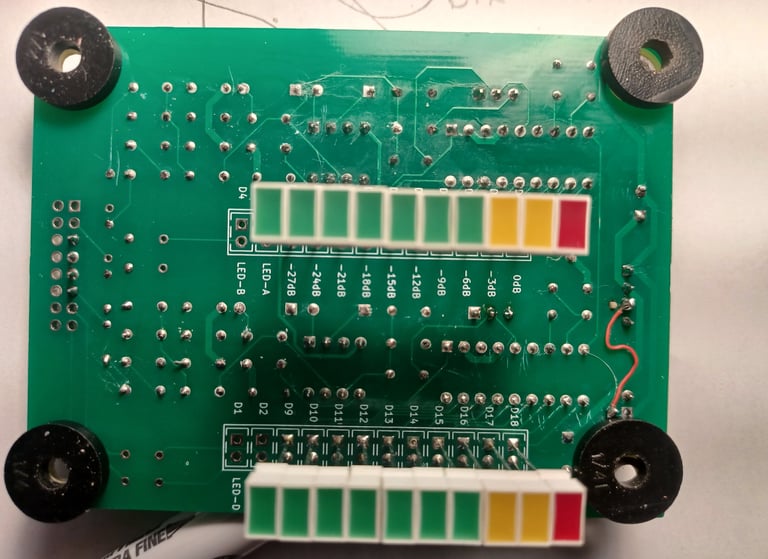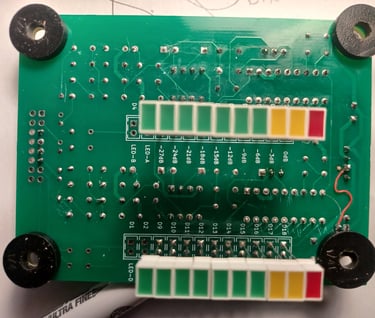 This module is designed to be installed on an amplifier’s front panel, so most of the connectors and most of the components are installed on one side of the board, and the LEDs are installed on the opposite side. A 3D-printed adapter allows for flush mounting the LEDs and simplifies mounting it to the backside of a panel through a rectangular opening. Pictured is a simple jig made from plywood and 6-32 screws to neatly align the LEDS.