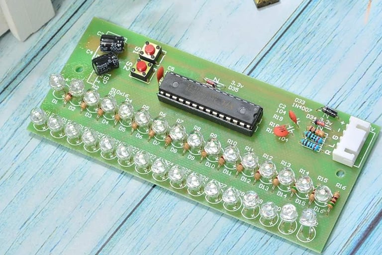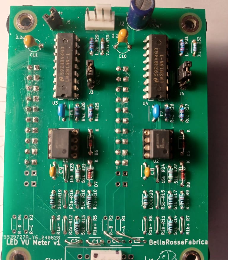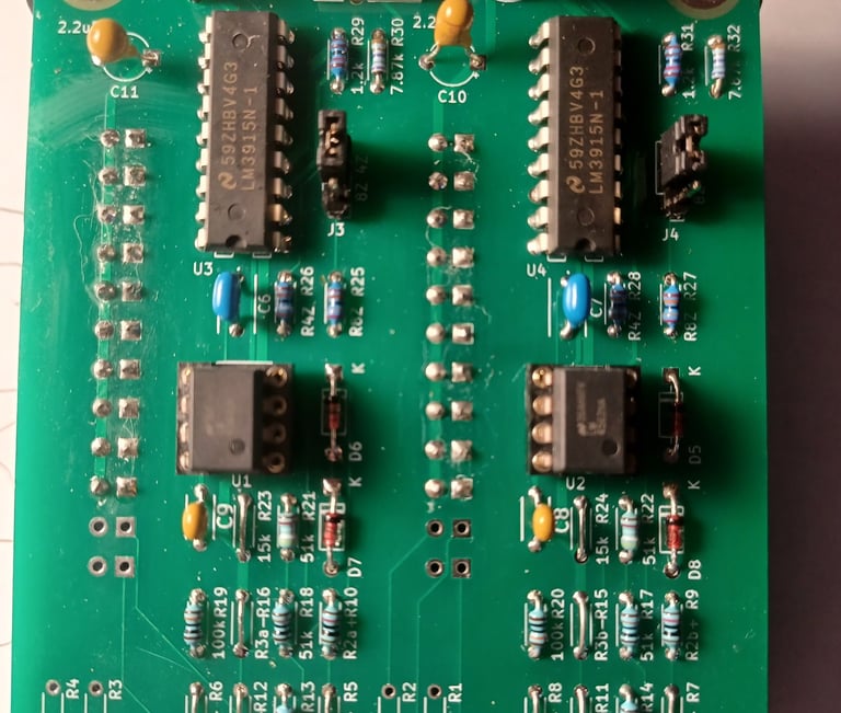 With an initial design, I ordered some parts and some nice Lumex rectangular LEDs, but I hit a major snag. The LM3915 is out of production, so none of my usual distributors had them. A web search turned up lots of eBay stores that claimed to have them. I really prefer not to buy on eBay, Alibaba, and Amazon for the obvious reason of fake products, but it seemed I had no choice. I bit the bullet and bought 10 units on eBay. I bread boarded up a test circuit and finally had something that was functioning, but when I tested it with a cheap amplifier, it just wasn’t as accurate as it should be. It took a few weeks before I got out a magnifying glass to discover that I had bought LM3915s instead of LM3915s. The difference between the two is that the LM3915 is logarithmic (dB) and the LM3916 is linear. Once I figured this out, my circuit was accurate, just not what I needed, so back to eBay. I ordered 10 LM3915s from another supplier and swapped one in for a LM3916. Same results; it turns out these were not TI but some Chinese brand, and guess what? They must be LM3916s under the paint. I searched again, and much to my surprise, JameCo sells them for 3 times the price, but I can trust them. I ordered 10, and lo and behold, it worked and is very accurate.