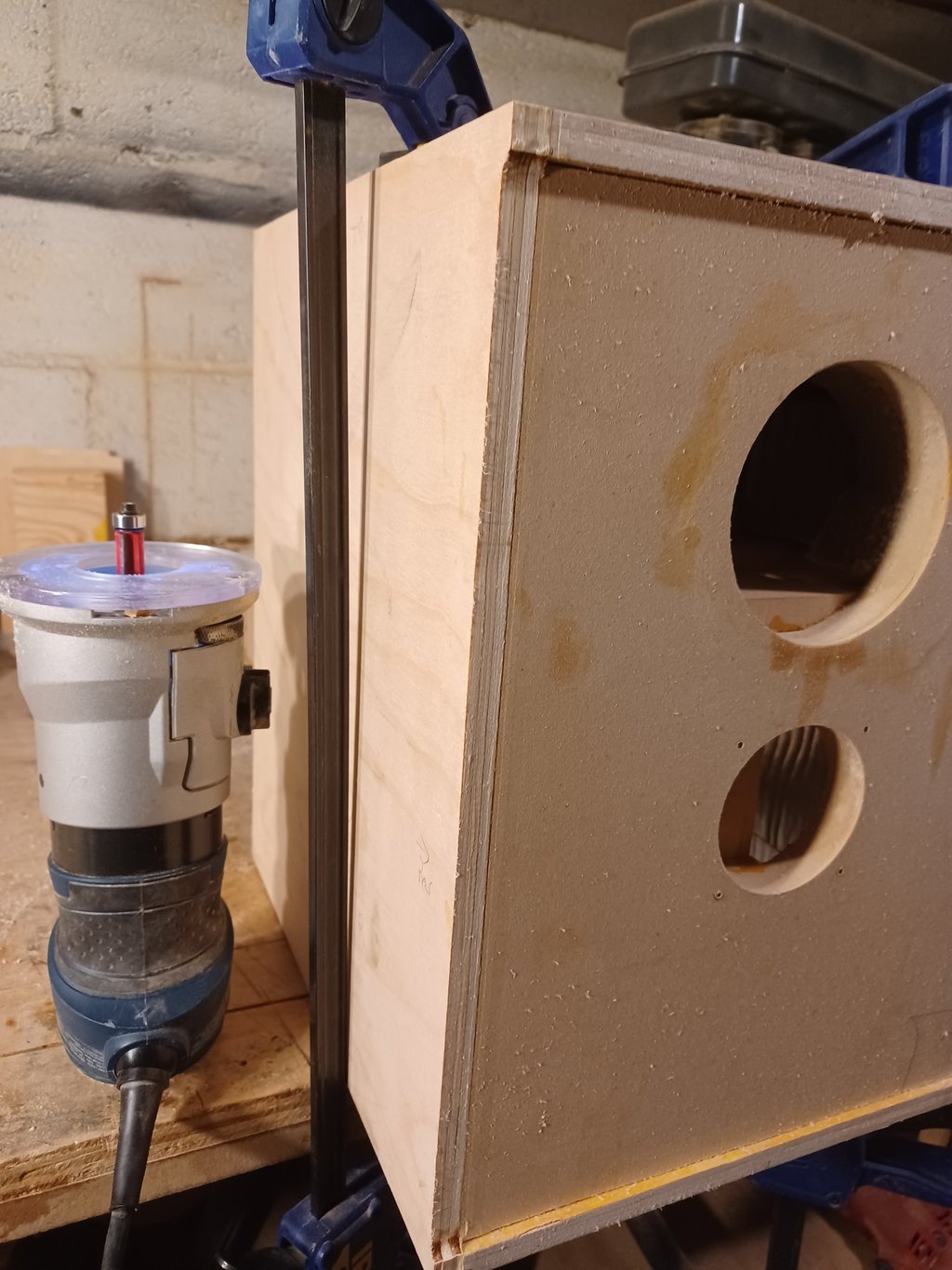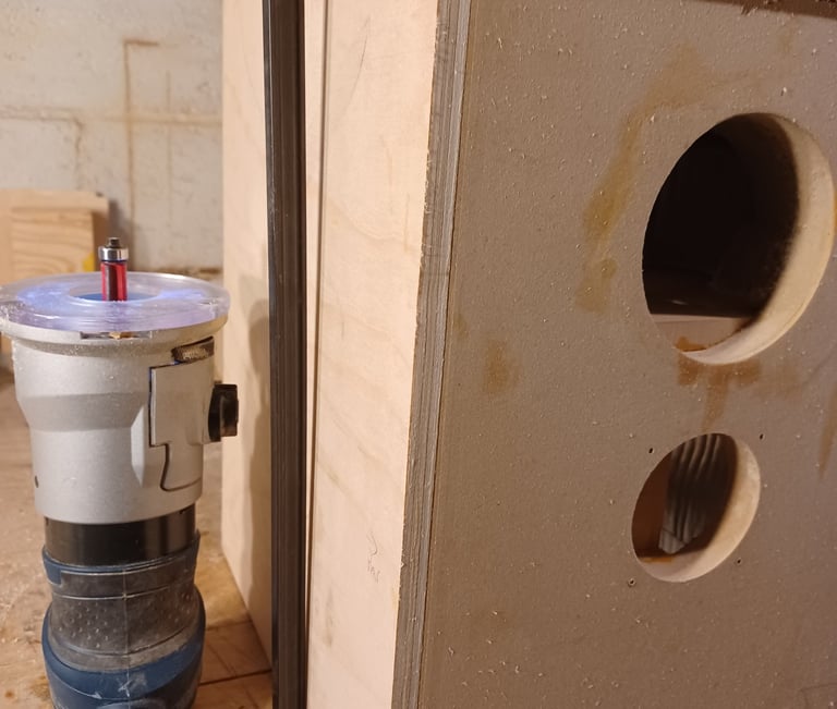 First step is to glue the 1/4 dowel pegs into the inside of the outer baffle. Next spread glue over entire surface of the inner baffle. The photo on the right tries to show the alignment peg. Align the pegs with the holes and push the baffles together then apply all the clamps you own. I use slightly damp Q-tips to make sure no glue gets in the T-Nuts. Once the glue has dried unclamp and use the palm router to trim the MDF square with enclosure.