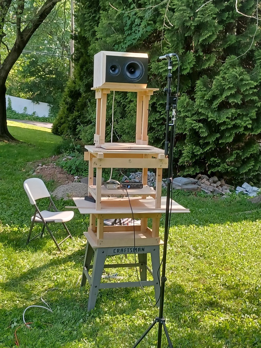 Now that the final enclosure is complete it can be used to make polar measurements and impedance measurements. These will be used to model a crossover. I use the pictured turn table which gets the speaker to a height above the ground of nearly 8 feet. My measurement rig consists of a Behringer UMC204HD USB Audio interface, a SoundID Reference measurement microphone from Sonarworks and REW. I use a Dayton DATS3 for impedance measurements. Then all this data is used in VituixCAD2 to make a crossover design. This is perhaps the longest part of the process. Once I get what I think is a good crossover I will order a single set of components and add other parts to get to the free shipping threshold.