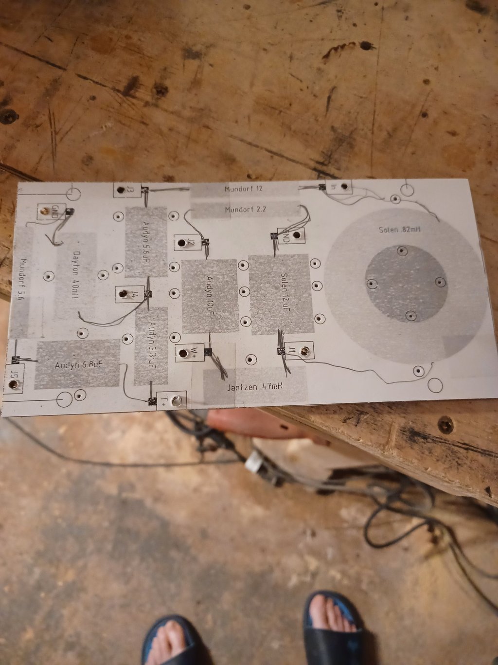 Once the final crossover has been tested outside the enclosure I will layout the components in CAD. If it needs to be installed through the woofer cutout it is important to verify that the finished board will fit through the hole. This is a 3D problem, not just 2D. I use Molex SOLDER TERM .438 style 3 posts screwed to 1/8 hardboard to solder the components together. I also layout holes for zip ties to secure the components to the board. The CAD drawing is printed on card stock to use as a drilling guide. I use silicone caulk under the capacitors and inductors to prevent vibrations.