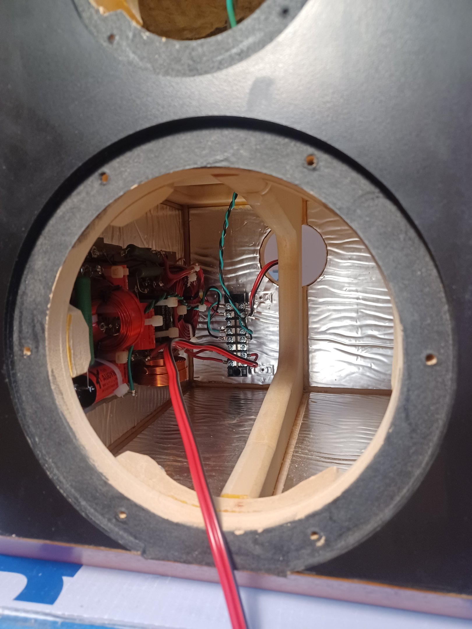 Installing the crossover through the woofer hole is a little awkward so pre-drill the mounting holes before the glue up. It still requires a stubby screwdriver and a blood sacrifice.
