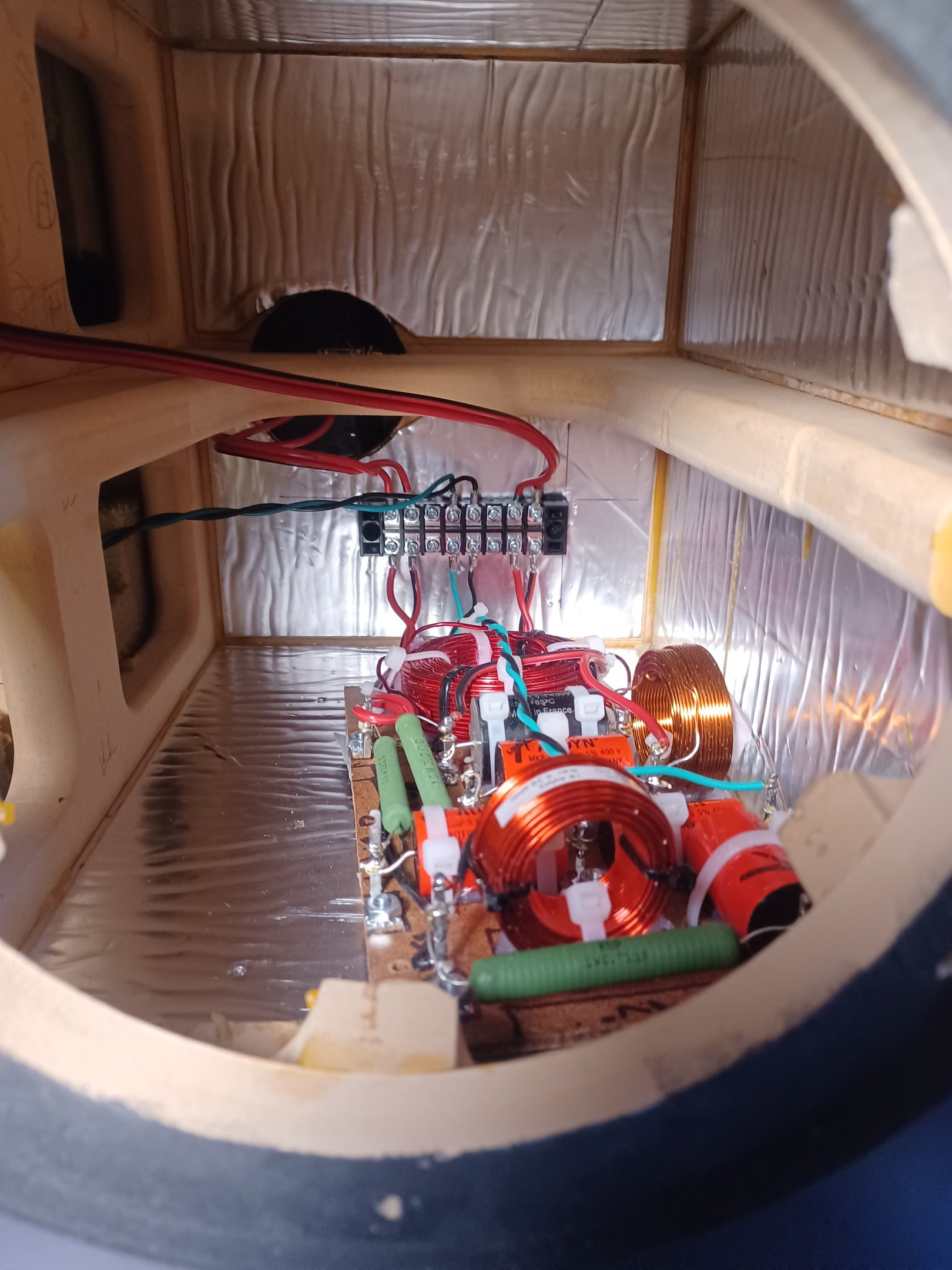 Blame it on my electrical engineering background but I don't believe wire does anything but conduct electricity at audio frequencies. So no fancy wire or connectors for me, in fact I chop up old power cords for internal wiring if it is the correct gauge. I also like to use a terminal block and solder lugs to inter-connect the drivers to the crossover board. This gives me the flexibility to convert to an external crossover or change to an active design. I don't use electrolytic capacitors but I do not use high end audio capacitors either. Same goes for inductors, if I need a large value I use laminated iron core inductors.