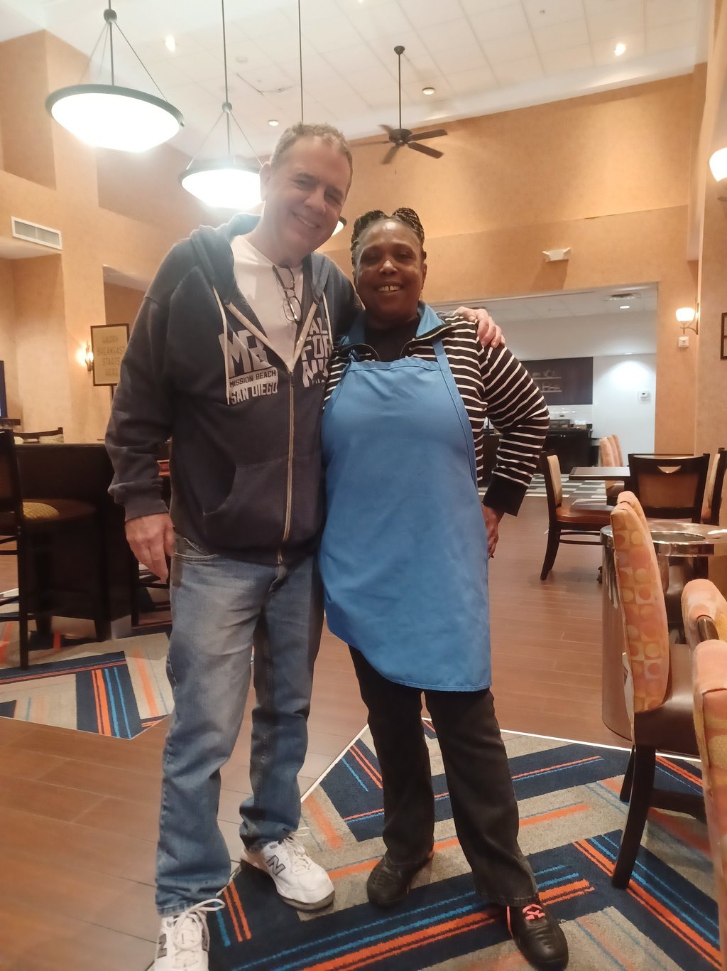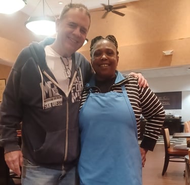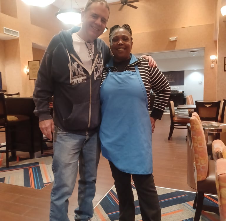 I woke up at 6:00 AM, showered, packed and headed down for breakfast. On entering the breakfast room I received the friendliest greeting from Helen the women in charge of the breakfast room. After I had eaten a good breakfast I sat down and told her my story. She had kidney stones and recommended a tea made from peach leaves. I asked, “Where in the hell am I going to get peach leaves in Elk City, OK in February?” She responded, “Nowhere.” We had a lot of laughs and this lifted my spirits. I said, “I know how I got here, but how did you end up here?” She said, “Many years ago she got in some trouble and left LA and ended up here and was adopted by some local police and never left.” She also told me, “You couldn’t have picked a nicer place in the world to get sick.” This is true, everyone at the hotel, the ER and Walgreens were incredibly friendly to me. I went back to my room got my bag and was about to check out when I heard Helen’s voice again. I went back and asked to get a picture with her. While we were posing she asked, “How are going to explain to your girlfriend the picture with this beautiful piece of chocolate?” I thanked her for her joyful personality that had truly lifted my spirits.