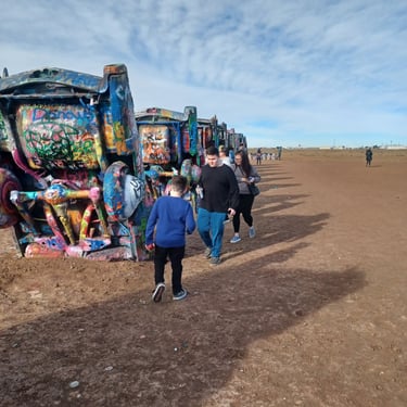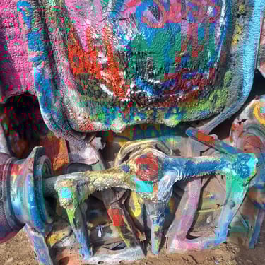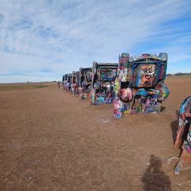 I’m finally back in the car heading west on I40 and feeling like I can actually make it a full day of driving. I discovered that I needed to take my Meloxicam by 10:30 AM or the pain would come back. No problem, I haven’t adjusted to any time zone so lunch a 10:30 central time is fine. First stop is Cadillac Ranch in Amarillo, TX. I saw before I knew what it was. I noticed there were people walking through a field on the other side of the highway before Waze tells me to get off the highway. I passed this way back in 1977 on the bus, we didn’t stop but I vaguely recall seeing cars buried in the ground. What seemed different was how colorful they are, when I get closer I find out why. People have been tagging them with spray paint for so long that they are covered with inches of paint turning them into grotesque caricatures of cars. A family was painting while I was there and offered me to use their paint, but I passed. On the way out I met a couple with a dog and the husband had an Ithaca sweatshirt. I asked if they were from New York, but they were from ST Louis and their daughter went to Ithaca. I skipped Palo Duro Canyon State Park because it was an hour detour and I wanted to get as far as I could.