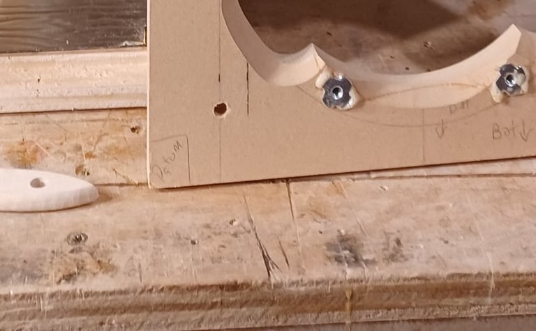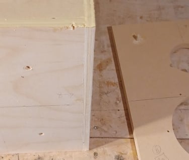 First step is to glue the 1/4 dowel pegs into the inside of the outer baffle. Next spread glue over entire surface of the inner baffle. The photo on the right tries to show the alignment peg. Align the pegs with the holes and push the baffles together then apply all the clamps you own. I use slightly damp Q-tips to make sure no glue gets in the T-Nuts. Once the glue has dried unclamp and use the palm router to trim the MDF square with enclosure.