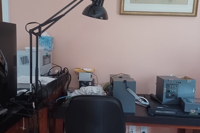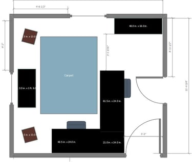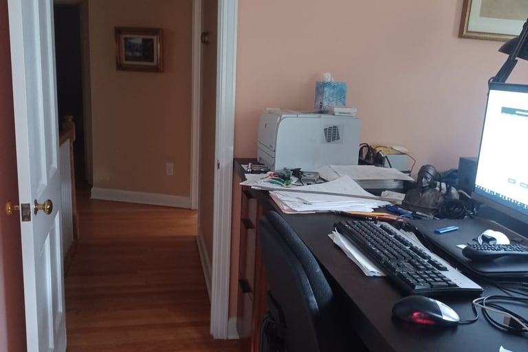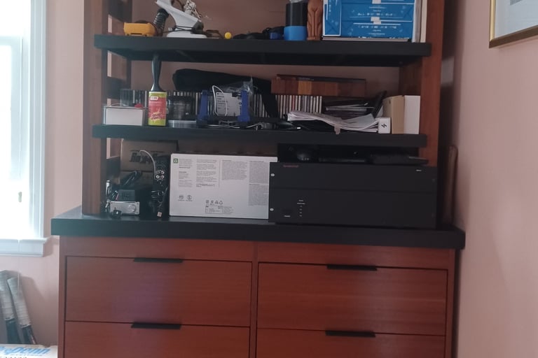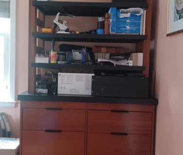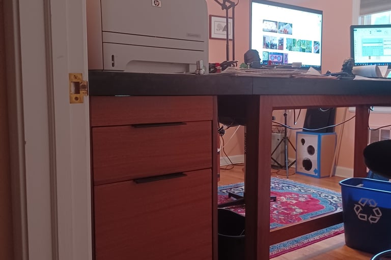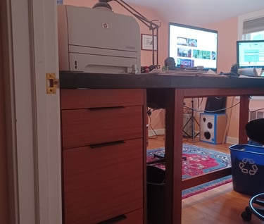Just before the Covid lockdowns we started working from home on Fridays, I was using a drafting table as a desk. Maureen suggested I should build her a small desk to work at. So instead I designed a complete set of mid-century modern inspired office furniture. It is made from Baltic birch plywood, black matte Formica and 4/4 Sapele. Every piece is modular and can be broken down to manageable units by removing 1/4-20 bolts. The shelves and desktops are made from sheets of Baltic birch supported with a lattice of plywood ribs underneath.