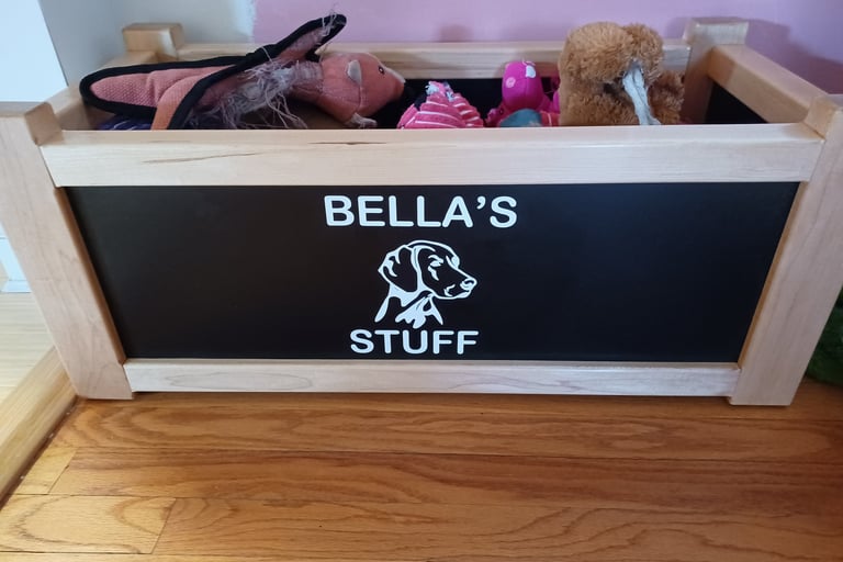 I made this so Bella had a place to store her toys. I made it just the right height for her to be able to reach the bottom. She is good at emptying it but she never puts anything back in it. The frame is made from 8/4 rack maple planed down to 1 1/2 inch which are mortised and tenoned together. The sides are 1/2 plywood with Formica laminated on both faces which are fitted into grooves in the frame. The bottom is 3/4 plywood also laminated with Formica and simply sits on to of the lower frame rails. There are no fasters used. An artist friend from the local dog part made the graphics for me.